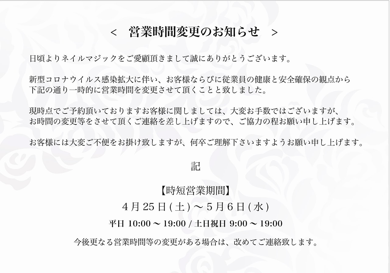 営業時間変更のお知らせ [2020年4月25日(土)〜5月6日(水)]|仙台のネイルサロン『NAIL MAJIC(ネイルマジック)』
